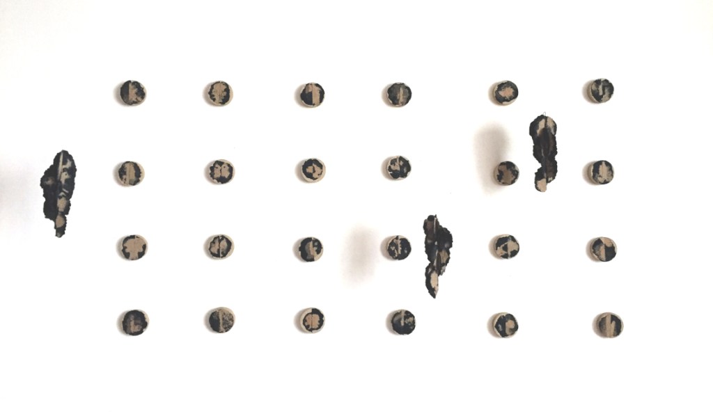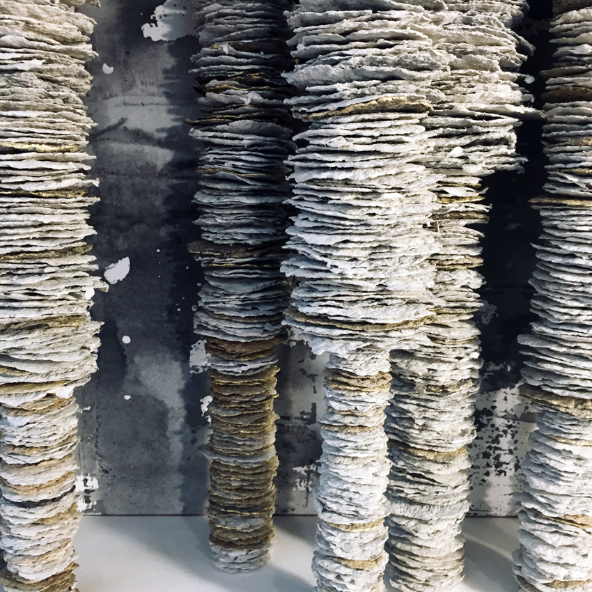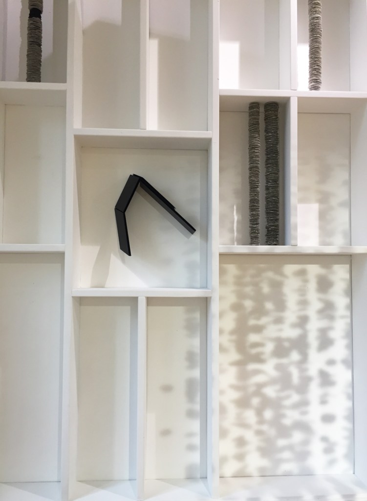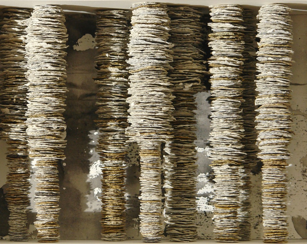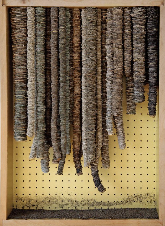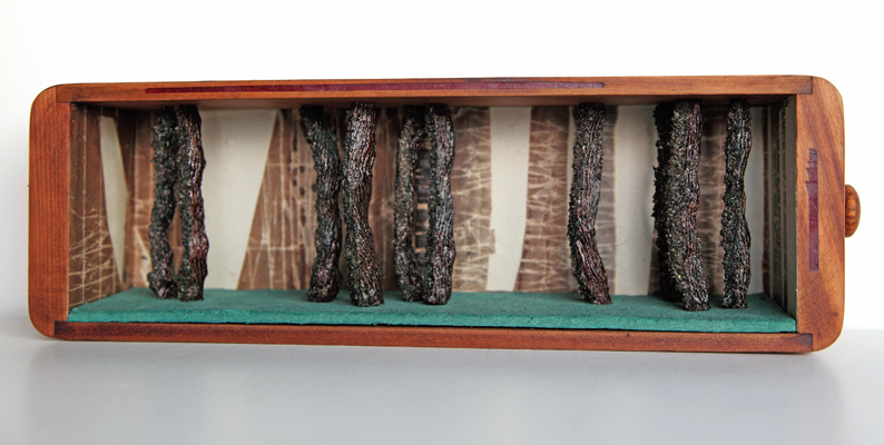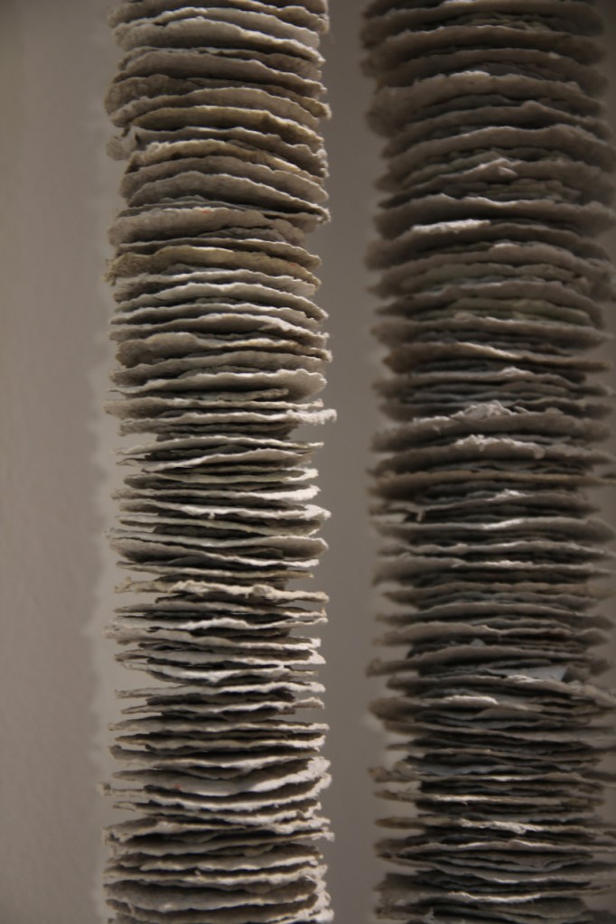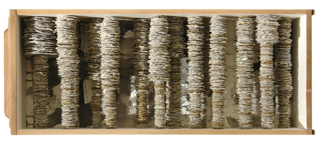 LES COLONNES — 2016, 30 x 70 x 14 cm, papier mâché, encre sur papier, tiroir en bois