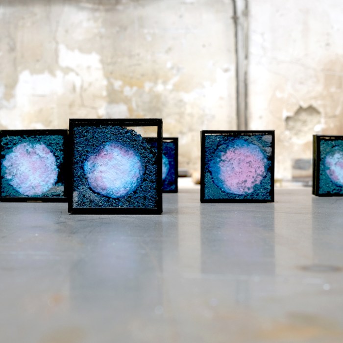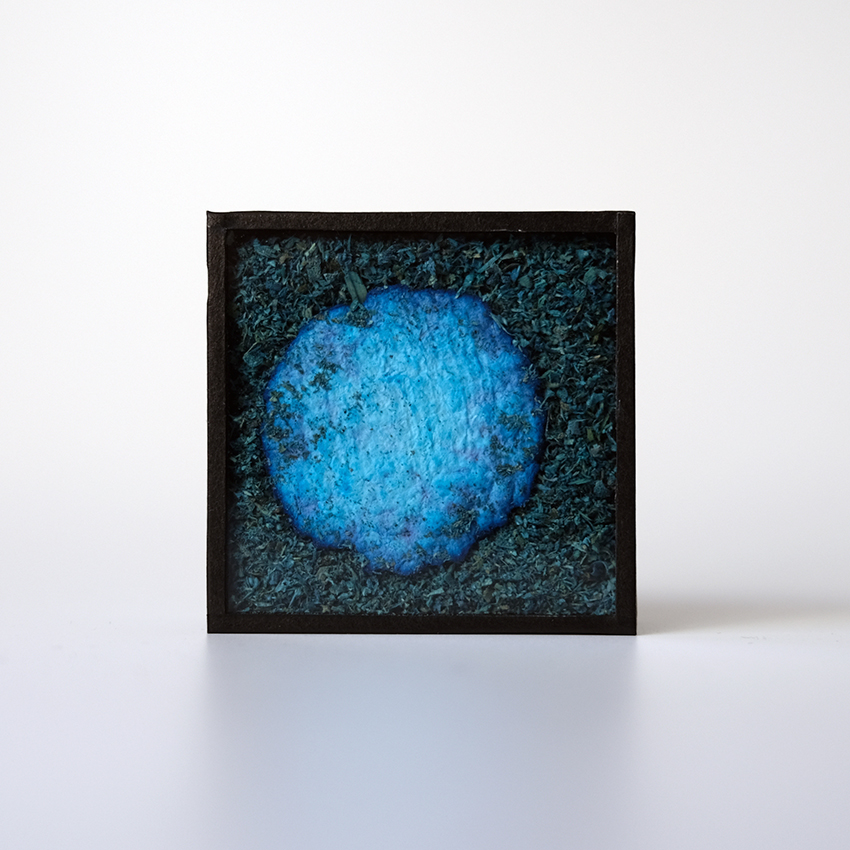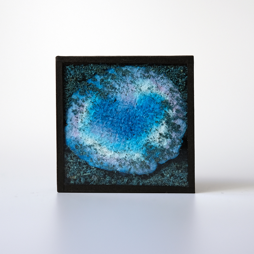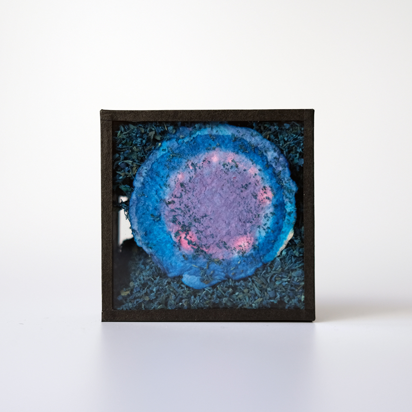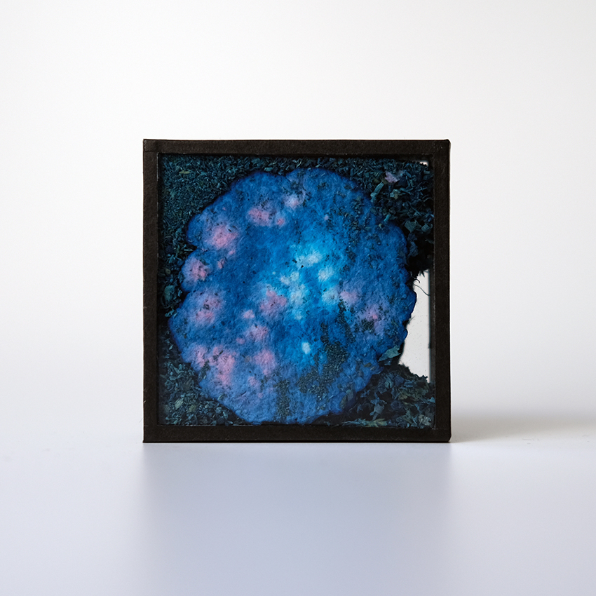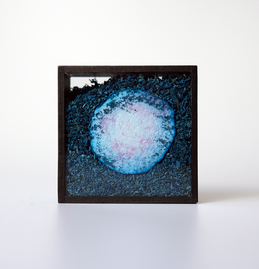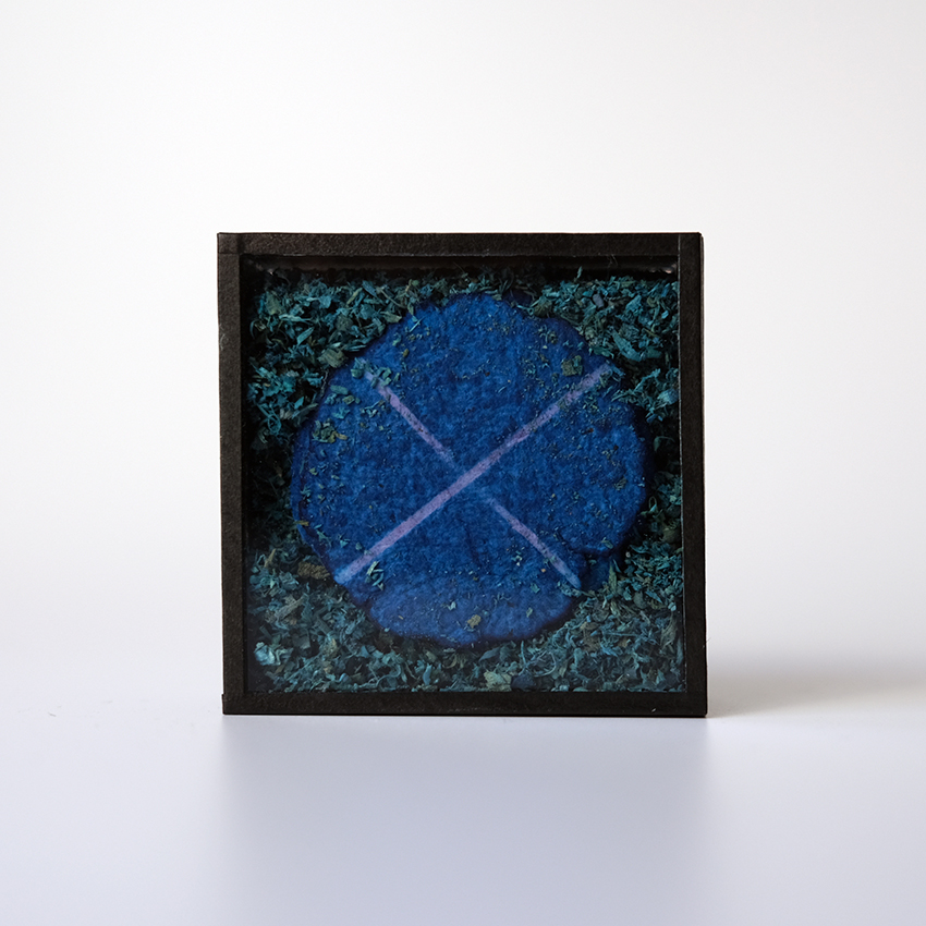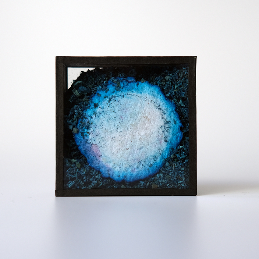 PLUIE RONDE (Extrait) — 2023, ensemble de 24 boîtes 6 x 6 cm, papier mâché, encre, sciure, carton et verre